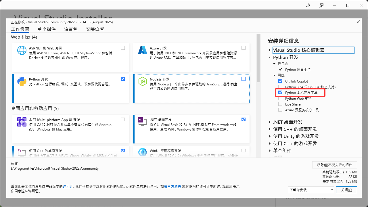 在 Visual Studio 安装器中,勾选并安装 Python Development(Python 本机开发工具)。