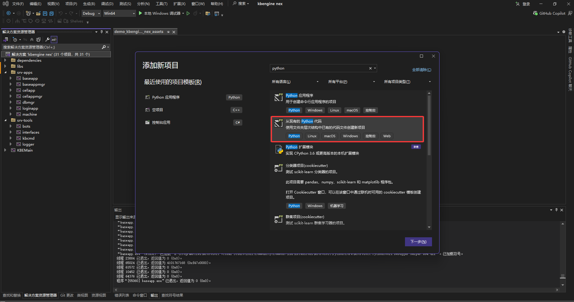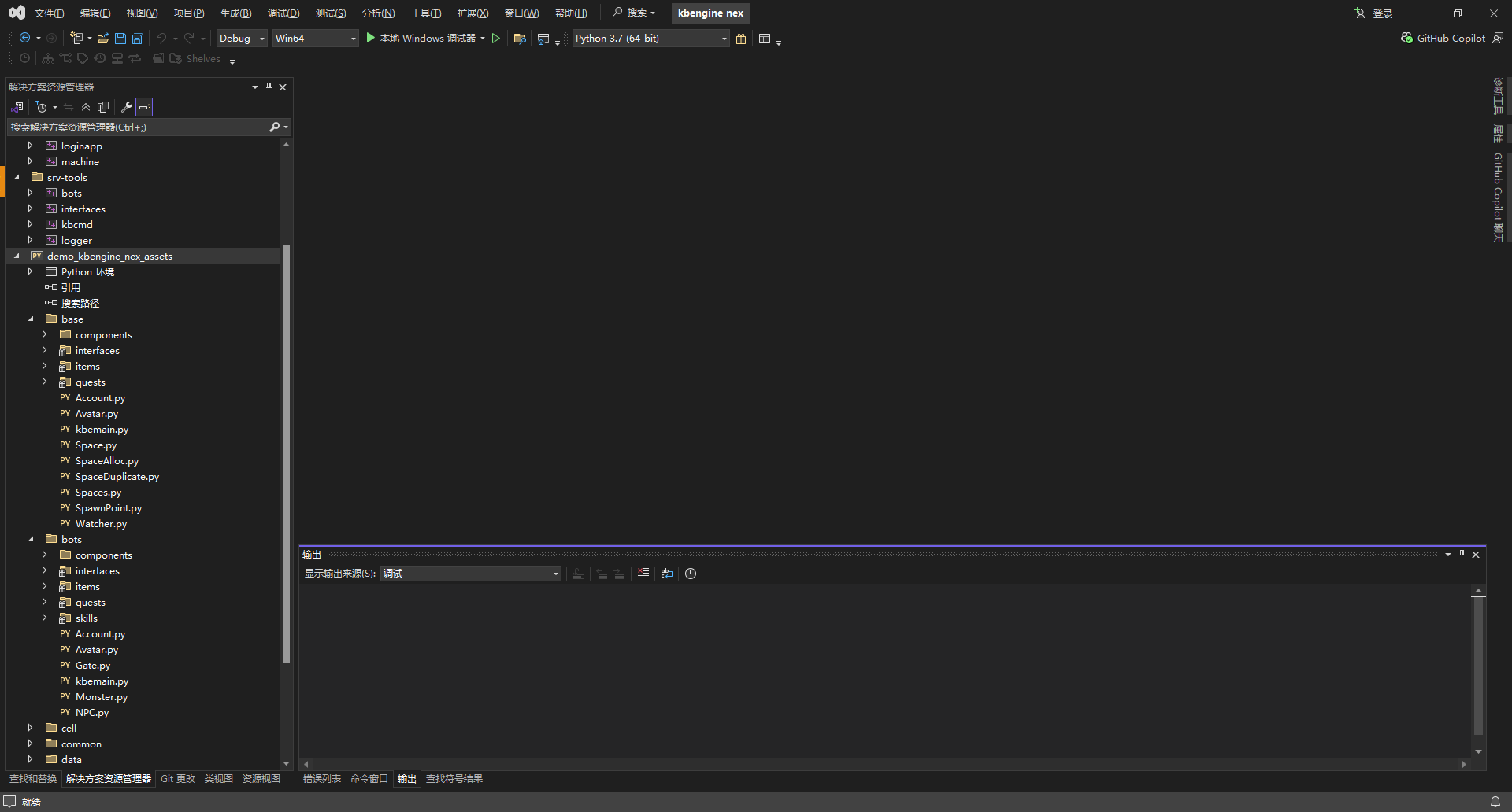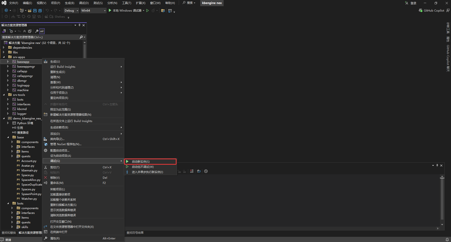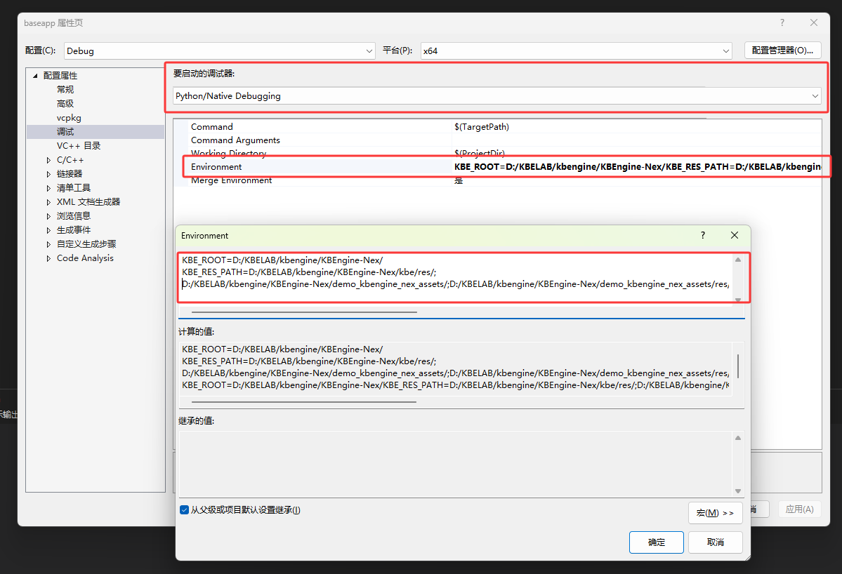 KBE_BIN_PATH=D:/KBEngine-Nex/kbe/bin/server同时,将调试启动器修改为:Python/Native Debugging