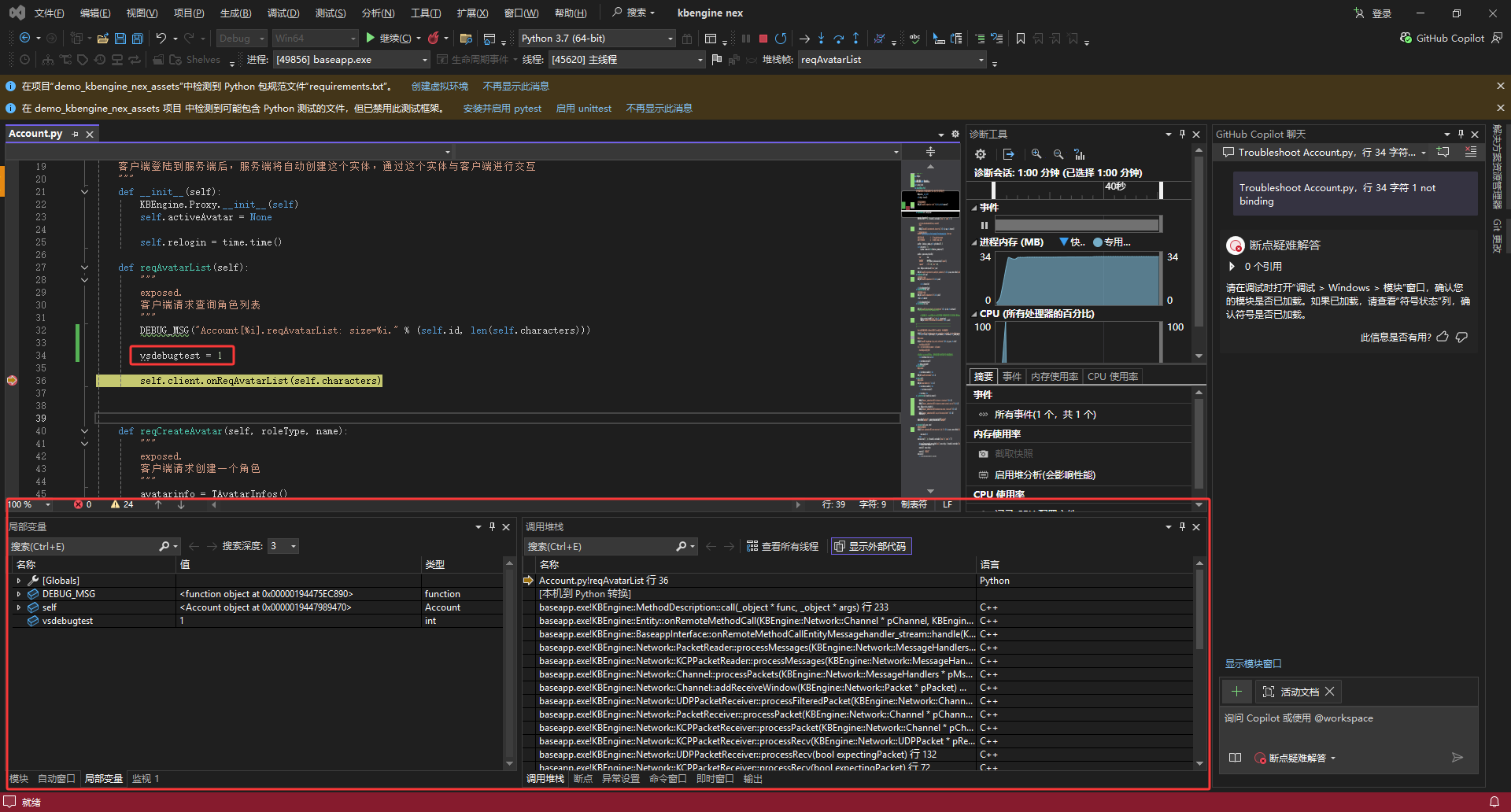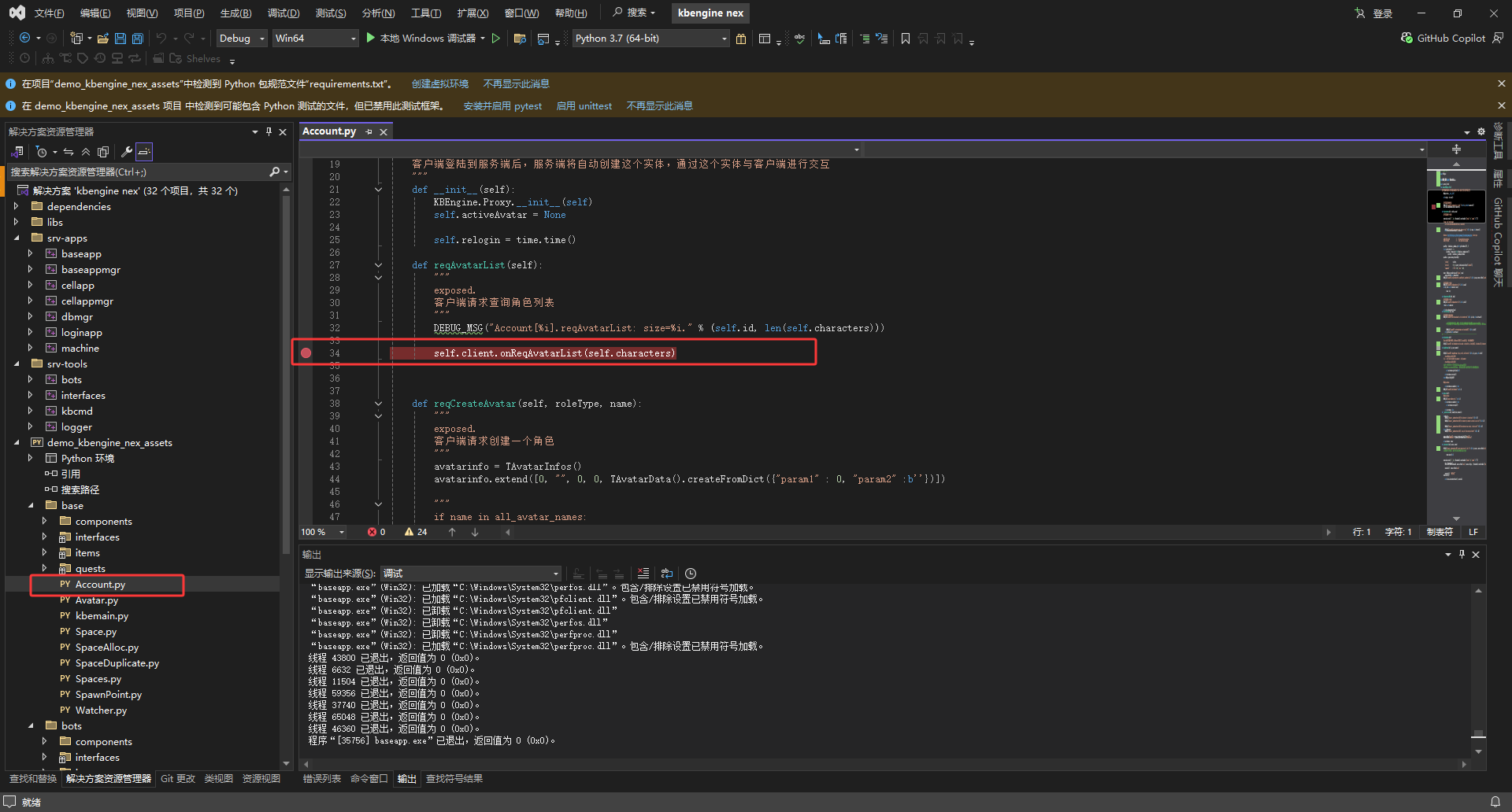 此时即可在 VS 中命中断点,正常调试 KBEngine Python 代码。