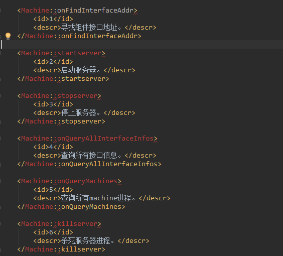 </Client::onRemoteMethodCall>Client::onRemoteMethodCall: 协议的作用域, Client表示客户端的协议,onRemoteMethodCall为协议接口的名称。id: int,协议的ID。descr: string,协议的描述。只是为了开发者做一个描述,并无实际用处。arg: 每个arg代表一个参数,第一个arg则为第一个参数,以此类推。arg内填写的是参数的类别。
