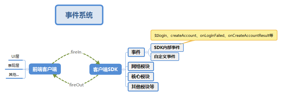 通过事件系统,业务和表现层以及SDK内部可以解耦,使三者相对独立。它们之间通过事件或消息的方式进行分发并完成通讯。