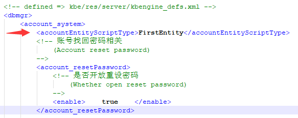 2、找到dbmgr->account_system标签,在其下添加accountEntityScriptType,并设置为FirstEntity。结果如下图: