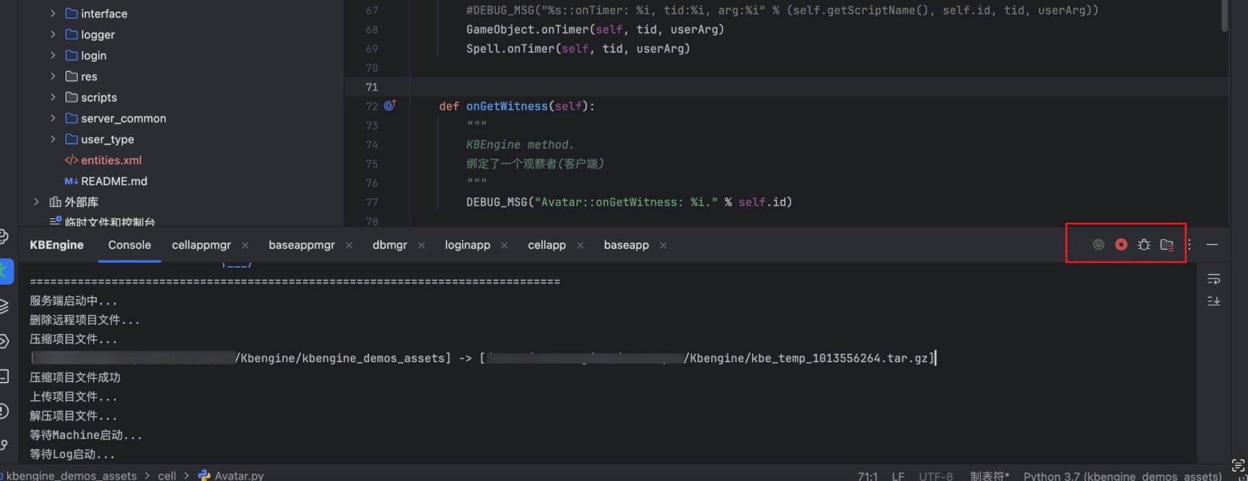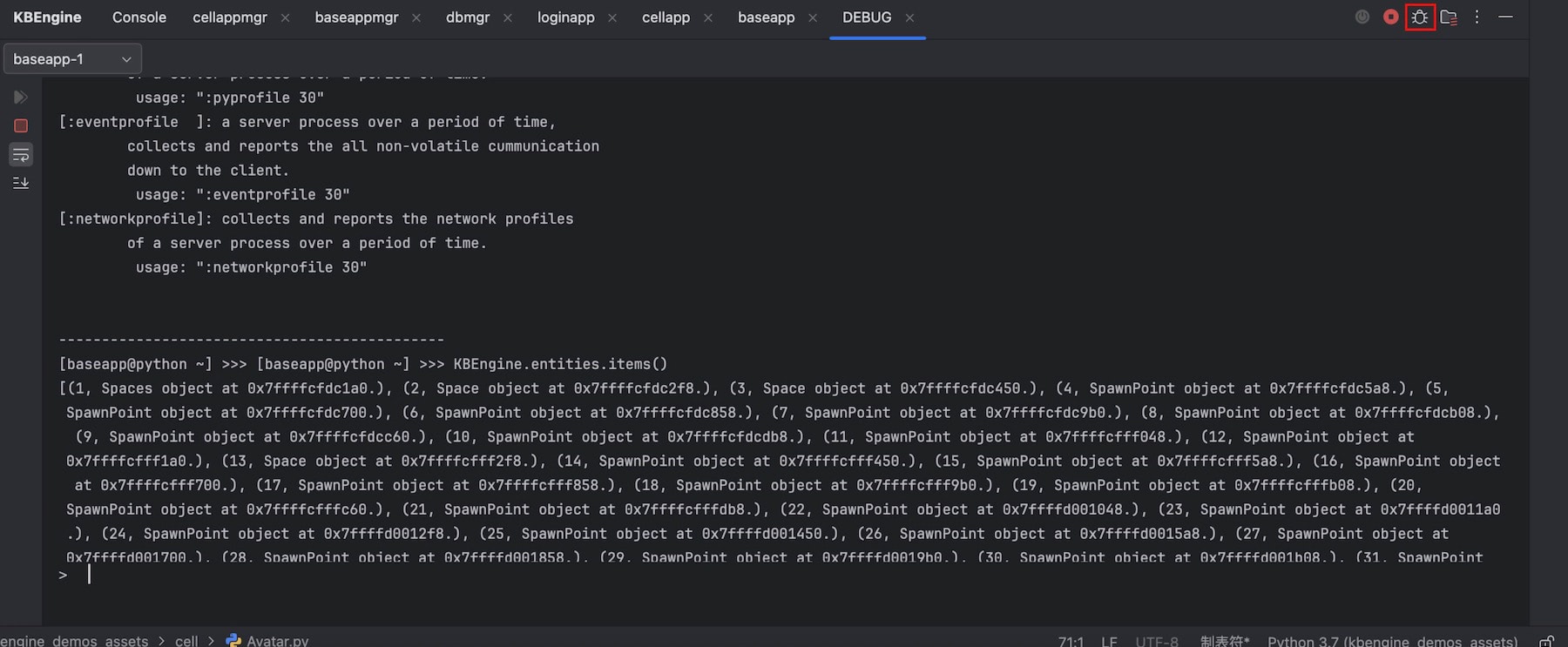 telnet密码请查看kbengine_defaults.xml或kbengine.xml中 [APP]->telnet_service->password