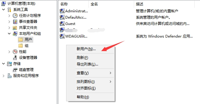 以Win10为例:打开“计算机管理”,右键选择”新用户”。如下图: