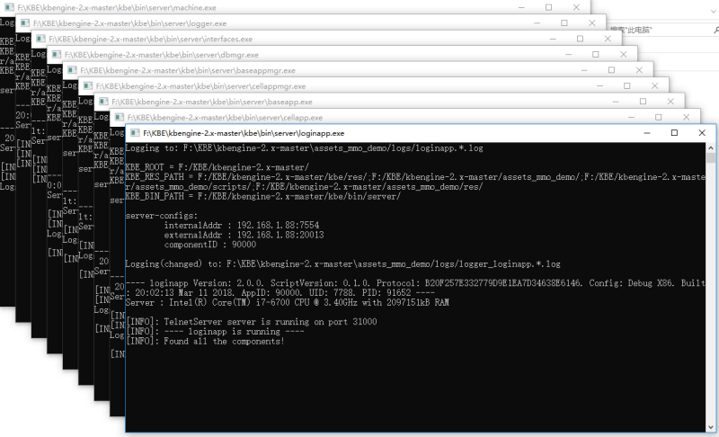 ok,看到所有窗口都出现”Found all the components!”时,恭喜你,成功启动了引擎!!