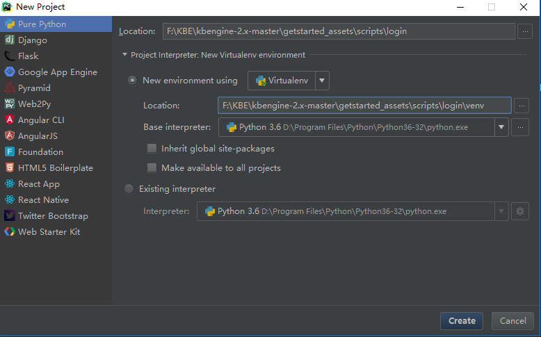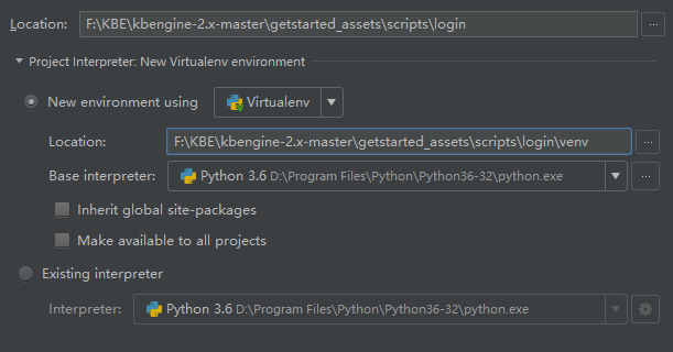 我们选择Pure Python的Project类型,并在Project Location选择{项目资产库}/scripts/login,Project Interperter选择New environment新的虚拟环境(因为需要每个app都有自己的环境,并配置自己的tips模块),虚拟环境的Location可以设置为对应app的脚本文件夹(当前例子是login)下venv,这样与所要开发的app的文件夹结构保持一致。