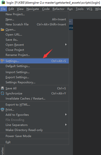 在开发时,除了专项的app内部开发,经常会碰到一些共用的模块,比如我们默认资产库中的common、data、entity_defs、server_common以及user_type,都是在不同app上共用的。我们需要增加进Project Structure配置中,使得更加IDE环境完整。点击File,在下拉列表中选择Settings,如下图: